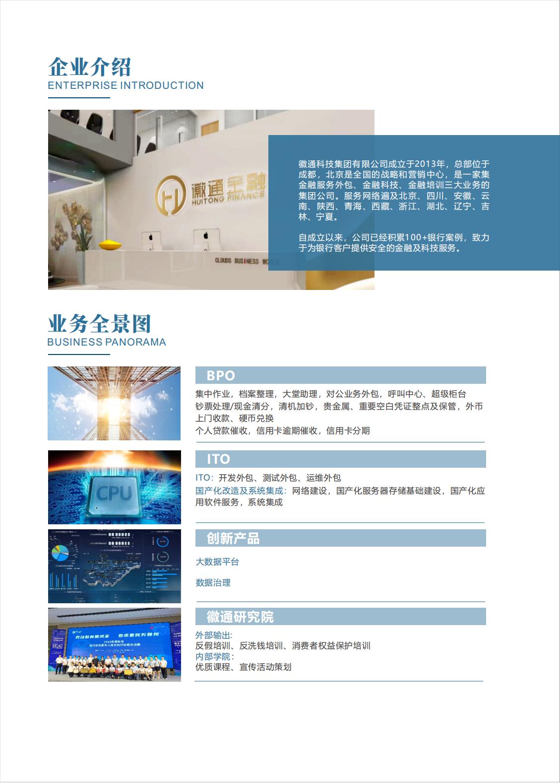 徽通科技集团有限公司(以下简称徽通公司)成立于2013年,注册资本5000万元,是一家能为银行业金融机构提供集金融科技、金融培训、 金融服务外包为一体的专业化金融服务公司。